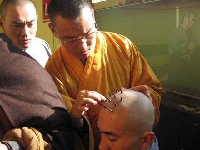 Let's look at a controversial practice among some Chinese Buddhists called "incense marks," or "head branding." Apparently, there was a time when being a monastic in China brought such prestige that a lot of fakes worked the crowds of gullible donors. (It's happening in China again today.) So the Emperor declared that all new monks or nuns must not only shave their heads, but have pieces of incense placed on their bare scalps to leave scars. (I guess the benefits weren't great enough for anyone to be willing to fake that!) Banned in China for some time, it has returned with a vengeance: formerly, there may have been just three marks, in a row paralleling and just above the (former) hairline, or sometimes there were nine (three rows of three). But since the "restoration," the standard seems to be TWELVE! Likewise, laypeople who take the "Bodhisattva Vows" may have three (or more) marks placed on their arms. I have met a few people from Taiwan who bear these scars.
